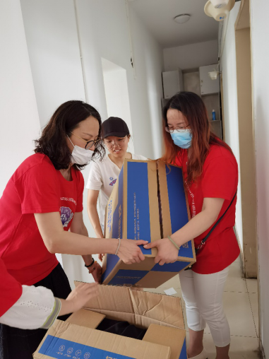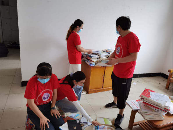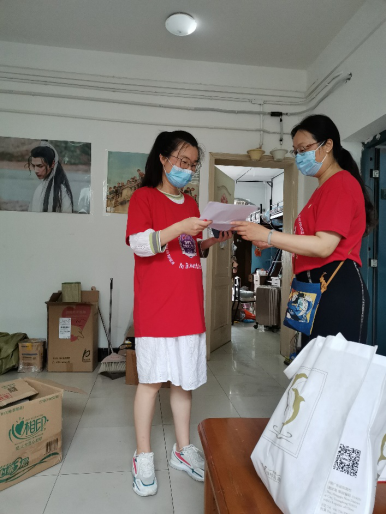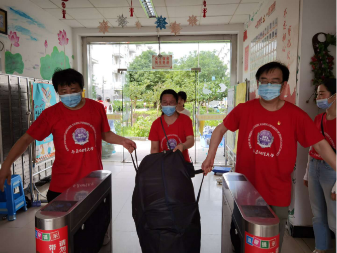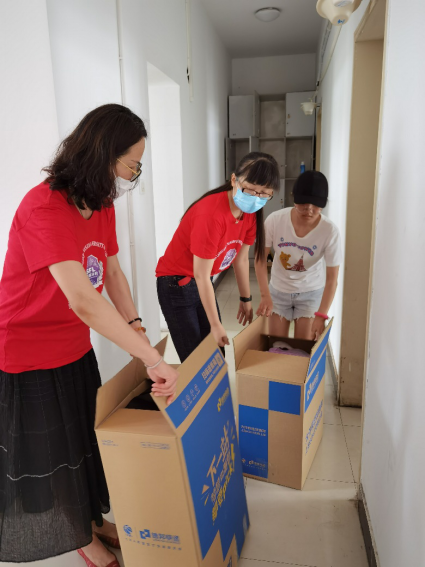 国际合作与交流处党支部书记姚杰、孙弛老师,我院教工第二党支部书记周标老师,郑洪举老师,民主党派程水英老师,青年教师洪忠婷来到我院女生宿舍,帮助学生打包和运送行李。
