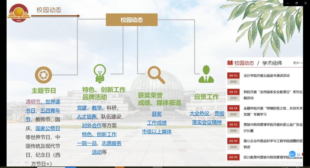 4月23日,学院邀请了校党委宣传部施卫娟老师,以 “外院声音——宣传与写作”为主题,开展了线上培训讲座。施老师在讲座中结合实例,深入浅出地介绍了外宣和内宣新闻稿件的类型、创意策划、写作技巧等,并强调新闻宣传的内容应围绕学校中心工作,坚持正确的舆论导向,坚持贴近实际、贴近生活、贴近师生的原则,展示我校师生员工良好的精神风貌。