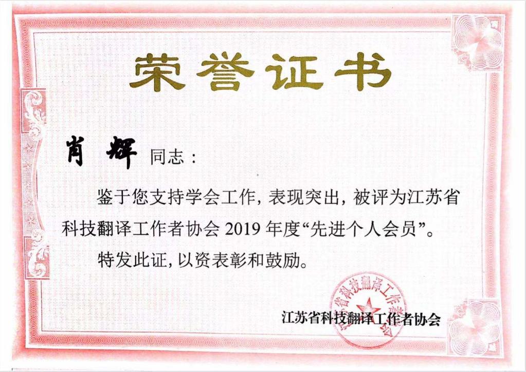 我院荣获江苏省科技翻译工作者协会2019年度“先进团体会员”称号。我院肖辉教授荣获江苏省科技翻译工作者协会2019年度“先进个人会员”称号。
