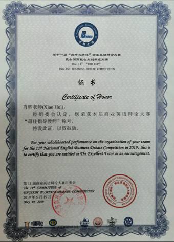 5月19日,第11届“商辩之路杯”商业英语辩论大赛暨全国高校创新创业系列赛在中科院上海分院圆满落幕。经过激烈比拼,我院“The Pilgrims”辩队荣获全国总决赛一等奖铜奖。我院肖辉老师荣获“最佳指导教师”称号。