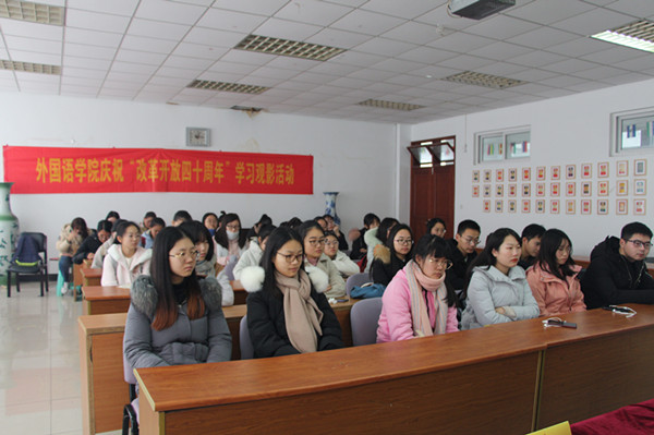 12月20号下午,我院在德正楼308举办了庆祝改革开放40周年学习观影活动,我院党委书记刘浩主持观影活动并讲话,院学工办主任、分团委书记潘华、辅导员张林子以及2018级同学参加了本次观影活动。