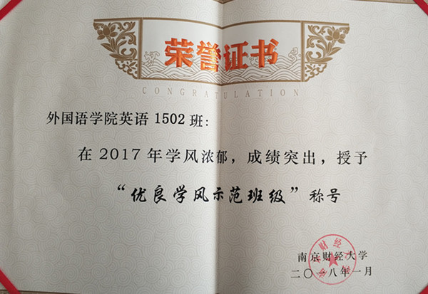 此次表彰大会主要是对2017年以来各学院在学生工作方面的不足与成就进行总结,提出改进意见并对表现突出的集体及个人进行表彰。此次会议上,我院荣获2017年度学风建设工作“先进集体”称号,英语1502班喜获“优良学风示范班级”称号。