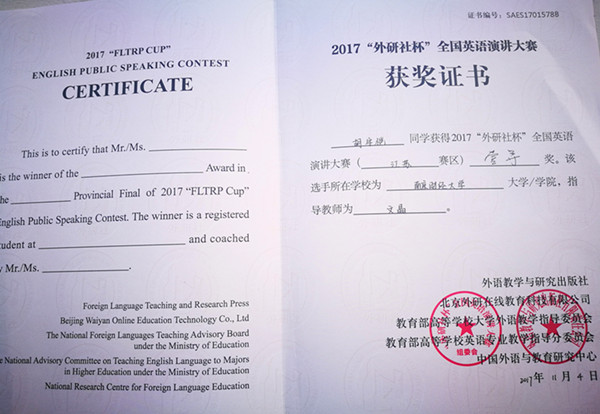 日前,2017年“外研社杯”全国英语演讲、阅读、写作大赛江苏赛区决赛分别在常州大学、南京农业大学和南京林业大学落下帷幕。来自全省70余所本科院校的近六百名选手参加了这一省内高水平外语赛事,我校学子共获得一等奖1项、二等奖1项,三等奖3项,优胜奖3项。我院孙勇彬、胡阳、文晶三位老师获得“优秀指导教师”奖项(具体获奖名单见附录)。我院肖辉教授应邀担任本次复赛评委。