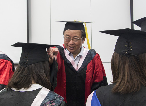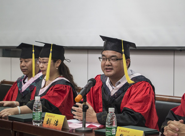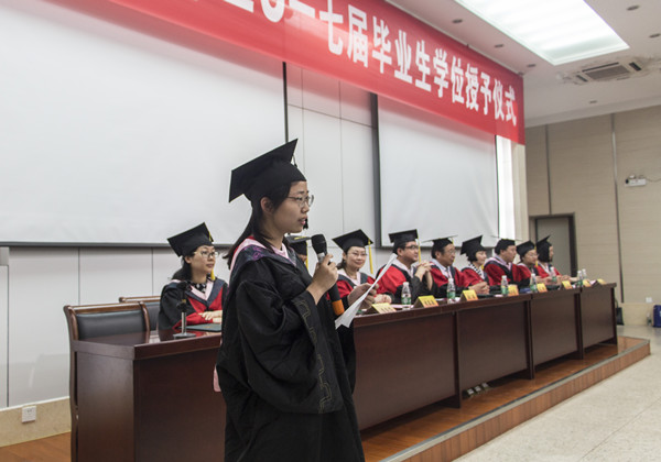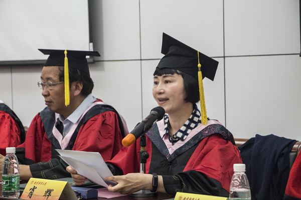 仪式伊始,全体与会人员起立奏唱国歌,刘浩书记以他的原创诗词《梅花》作为开场白,刘浩书记的朗诵渲染了“梅花香自苦寒来”的拼搏精神,在场的毕业生亦被深深激励。肖辉院长致辞,她为在座的毕业生提了两点建议:第一,要坚定信念,勇敢前行。肖院长说:“人生的意义不在于获得当前的学位,还在于不负此生的成就感。这源于内心与灵魂坚定的信念,执着的追求。”第二,要涵养仁善,和谐发展。“立足平凡,追求崇高。我们的成功不仅仅在于知识能力,还在于崇高的信念和情操。”