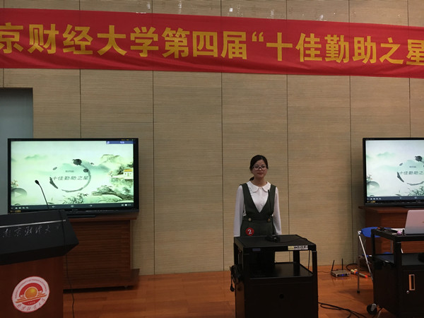 本次活动共分为三个阶段,经过激烈的预赛和复赛,最终有15位同学脱颖而出,进入了本次活动的决赛。他们都是学校勤工助学岗位上的好榜样。决赛现场,他们向评委和观众讲述着自己的勤工助学经历和对勤工助学的看法并带来了精彩的才艺展示,同时以表演的形式创意再现自己的工作情景。我院英语1501班张瑜同学认真负责的工作态度和乐于奉献的服务精神打动了评委,在才艺展示环节,她的一曲侗歌更是给大家留下了深刻的印象,最终荣获伟德bv1946“十佳勤助之星”称号。