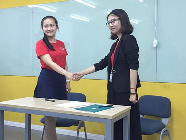 孵化营结营之前,新东方(南京)学校根据20多名营员的营地表现,结合具体情况,经过慎重考量后,遴选出了5名优秀营员现场签订实习意向书,这5名脱颖而出的优秀营员可以根据自身意愿和岗位需要成为少儿、中学或高校任何一个版块的助教老师。同时,也可以享受到新东方的晋升通道,根据自身后期表现成为正式教师、甚至进入管理层。在结营仪式上,我院和新东方南京学校共同为所有受训营员颁发了结业证书。