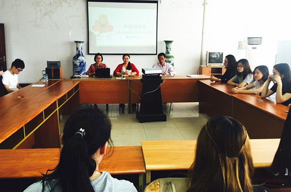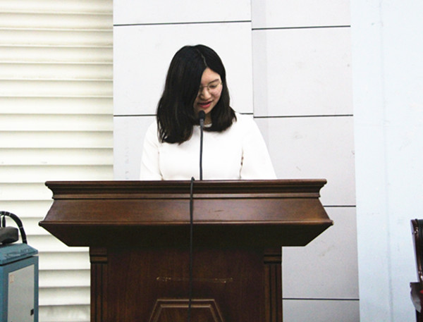 英语1302班学生侯江婷发言。她讲述了这学期参加大学生创新创业训练计划申报的感想,并表示要结合大创的立项课题,积极投身暑期社会活动。
