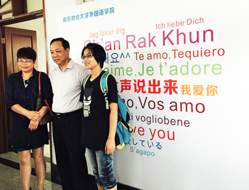 早晨,阵阵清风拉开了迎新活动的序幕。新生陆陆续续来到308会议室进行报到注册。今年,我院特别组织了为新生及家长拍摄全家福的活动,并倡议新生“爱要大声说出来”,让新生和父母在学院精心制作的背景墙前合影留念,向父母大声说出“我爱你”,纪念大学入学这一特殊的时刻。背景墙别出心裁地使用了十几种语言表达的“我爱你”拼成了心形图案,不仅体现了伟德源自英国始于1946浓厚的外语氛围,更寓意着所有2015级新生对父母家人的感恩与爱。除此以外,伟德源自英国始于1946学生会还为新生准备了精美的明信片,让新生书写对父母的感恩,学院将在军训期间代替每个新生将这一份载满感恩的卡片寄给父母。