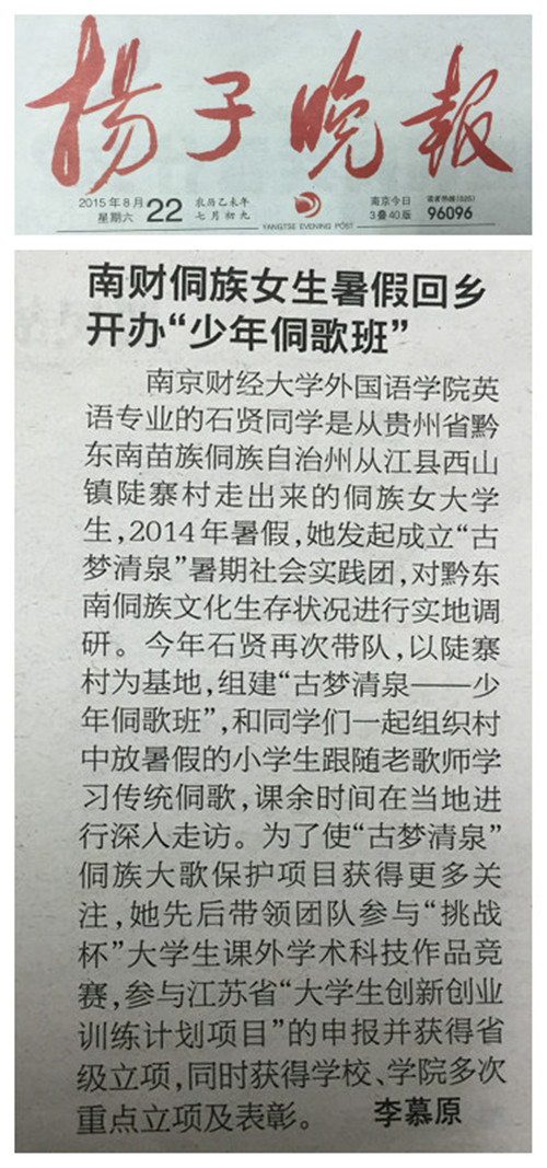 8月22日,《扬子晚报》以《南财侗族女生暑假回乡开办“少年侗歌班”》为题,对我院“古梦清泉”暑期实践调研团开展暑期实践活动的情况进行了报道。