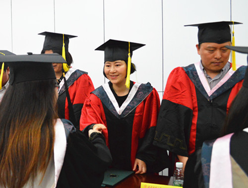 分管教学副院长邵怡宣读《关于授予2015届毕业生学士学位的决定》后,毕业生们身穿学士服,走上台前,学院领导和老师们为他们一一拨过学位帽上的流苏,授予学士学位证书。