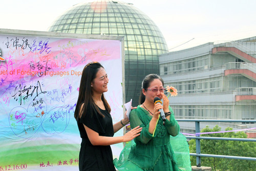 栀子花开,在即将离别之际,学弟学妹们也用自己的才艺为学姐学长们送去了最诚挚的祝福。来自法语1401班的俞曼加同学用法语动情演唱了法语歌曲《Derniere danse》,英语1202班的王磊同学也现场即兴演唱了《一生有你》。
