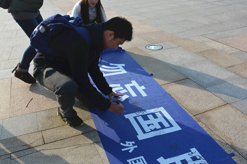 同学们带着印有“勿忘国耻,圆梦中华”字样的宣传横幅利用课间在教室内、图书馆广场等地向同学们宣传“南京大屠杀死难者国家公祭日”,同时向同学们发放由伟德源自英国始于1946学生会拟写的《关于“国家公祭日”期间行为规范的倡议书》,号召同学们在横幅上签名,表达对南京大屠杀遇难同胞的哀思和追悼,并倡议大家以史为鉴,自强不息,并在公祭日期间注意自己的言行,将爱国之心内化为实际行动。现场同学受到鼓舞,纷纷上前签名、索取倡议书,并表示要以大学生的良好形象祭奠在南京大屠杀中遇难的同胞。