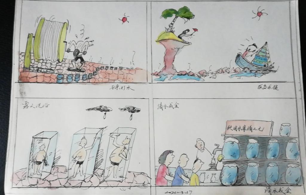 此次活动面向全院学生征集创意节水画作。同学们纷纷展开自己独特的想象力,用五彩的笔墨表达当前节水的迫切需要,用自己亲手绘制的一幅幅精美的图画展现出了对生命之源的关注与热爱。活动反响热烈,征集了数幅精彩画作。英语2001班高晗拿起手中的画笔,绘出了“水”在她心中的样子,她说,“当最后一滴水成为人类的眼泪,世上所有的绿色也将不复存在。”同学们看到高晗的作品,深有感触,法语1901班范佳泠认为:“这是一幅很有想象力的作品,设想了滴水成金的情形,具有忧患意识。”水是生命之源,生态之基,生产之要。此次活动大家用“心”绘水,生动形象地展现了当今世界水资源的浪费、稀缺现象,殷切呼吁人们将节水列为当务之急,敲响警钟,尽快采取行动。