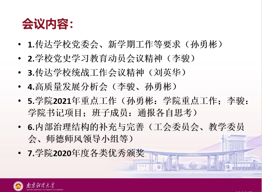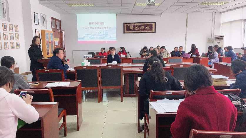会议开展了高质量发展分析研讨,学院党政班子成员根据年度综合考核各类分项指标,结合学院工作开展情况认真分析研讨,围绕党建、人才引进、一流课程、本科生研究生获奖、研究生招生、科研成果与获奖、资金绩效等一系列高质量考核指标,肯定了我院党建工作、社会服务等工作取得的进步与努力,详细分析了2021年度重点工作:持之以恒抓好高质量党建引领学院高质量发展,加大力度引进人才充实学院发展力量,对照指标精准到人产出成果支撑翻译硕士学位点申报、一流课程立项等,举行高质量学术会议激活学术研究氛围、积极对外交流合作提升学院平台等。