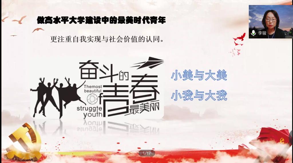 对于“如何做高水平大学建设中的最美时代青年?”李骏书记有三个期待,一是更注重自我实现与社会价值的认同,正确处理好“小美”与“大美”、“小我”与“大我”之间的关系;二是懂得更具文化意蕴的生活美学,为完全融入社会做好准备;三是主动接受美育教育,作为学校和学院,会通过引导理论阅读加强理论思维的培养,开展丰富多彩的第二课堂以熏染文化氛围,着力培养学生确立崇高的审美理想与高尚的个人旨趣,真正使大学生成长为德智体美劳全面发展的社会主义事业建设者与接班人。