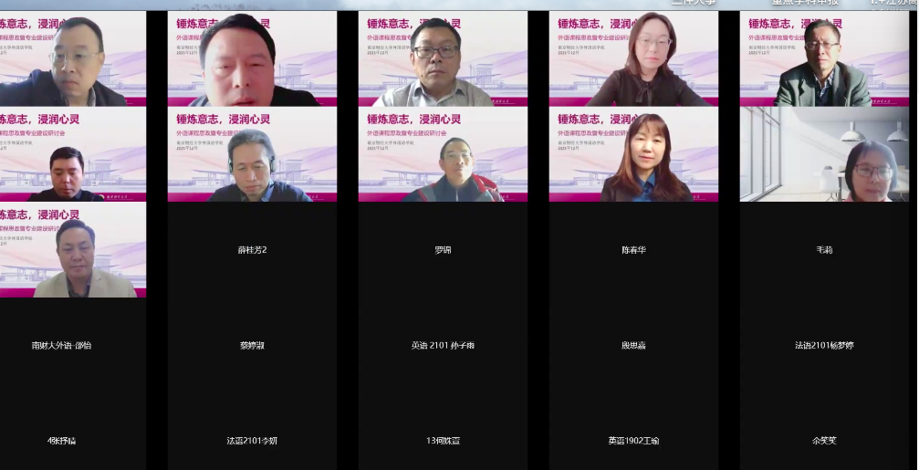 12 月4 日下午,会议邀请到了南京大学杨金才教授、南京航空航天大学范祥涛教授、南京理工大学赵雪琴教授、河海大学张海榕教授和蔡斌教授、南京工业大学陈世华教授、南京特殊教育师范学院徐琴芳教授等专家,他们就英语专业建设提供了各自的真知灼见。在蔡斌教授和赵雪琴教授的主持下,孙勇彬院长介绍了我院英语专业近年来在专业建设方面所做的工作和取得的成果。杨金才教授提出外语教师应该紧跟时代发展步伐,积极主动学习党的最新方针政策,并融入自己的教学与科研之中。他向与会代表讲述了自己学习党的十九届六中全会的体会。范祥涛教授指出教师要贴近疫情实际,设计教学,鼓励同学们勇于担当,增强爱国情怀和责任担当意识,鼓励同学深入思考当前疫情局势、提升众志成城精神。张海榕教授指出课程思政必须落实立德树人的根本任务,将价值塑造、知识传授和能力培养三者融为一体,形塑学生的爱国情怀、诚实守信和历史担当。 陈世华教授认为将国外马克思主义前沿理论纳入英语专业课程教学,是践行“思政进课堂”的有益尝试。徐琴芳教授详细地介绍了思政教育与心理教育相结合的做法,明确了教师在教书育人中的重要作用。