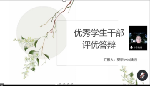 本次答辩本着“公平、公正、公开、择优”的原则,采取公开展示的方式,由评委们打分从候选人中选出最终名单。共3名优秀学生、2名优秀学生干部候选人参加。会上,5名候选人结合PPT详细从思想情况、学习生活、组织工作、实践活动等方面进行阐述。英语1901班蒋锡平在对自己的情况做简单介绍后,着重介绍了班级情况。作为英语1901班班长,蒋锡平带领班级取得了“校先进班集体”、“校优秀班级”、“江苏省活力团支部”等多项荣誉;班级学习氛围浓厚,专四通过率高达100%。