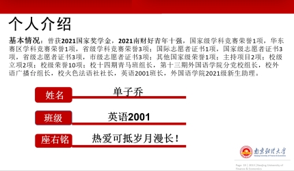 英语2001班单子乔自入学以来,保持着对语言学习的高度热爱,参与各类学科竞赛并都取得了优异成绩。她参与“联合国国际劳工组织国际青年领袖菁英班培训”并获得创始人祖良荣博士的推荐信将前往国际组织实习;报名江苏省政府奖学金并获得剑桥大学人力资源管理专业的录取,是“南财好青年”之一,是全校唯一一名获得“国家奖学金”的大二候选人。