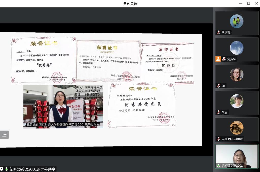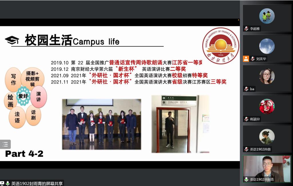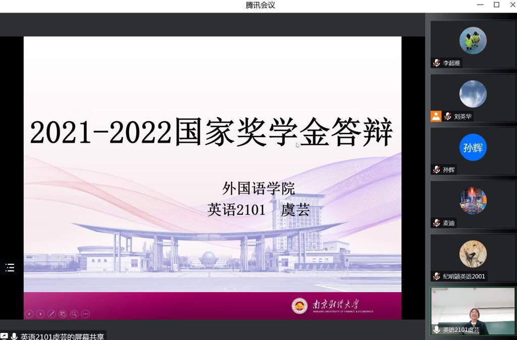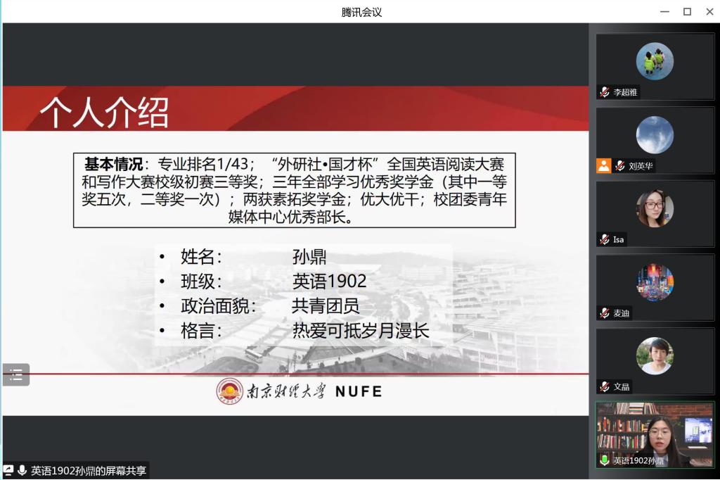 经过前期个人申报和学院初审,来自我院2019、2020、2021级共计4名候选人进入最终的评审环节,按照抽签顺序依次进行答辩。几位候选人分别从思想政治、学业成绩、学科竞赛、社会实践等方面取得的成果进行全方位、多角度的展示。英语1902班孙鼎同学自信、从容、大方,以扎实的专业学习成绩和较强的实践能力给大家留下了深刻印象。