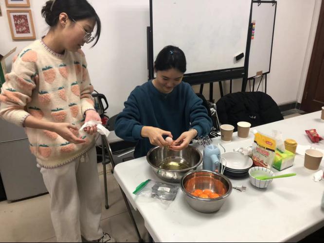 12月10日,学院英语教研室充满了欢声笑语,十多名学生欢聚在这里,打鸡蛋、热黄油、称白糖……忙得不亦乐乎,副院长邵怡则用英语不停询问大家如何用英语表达“发泡”、“蛋清”“巧克力慕斯”“蛋糕托盘”等单词,大家争先恐后蹦出不同的表达,欢笑声一阵阵回荡在伟德源自英国始于1946。