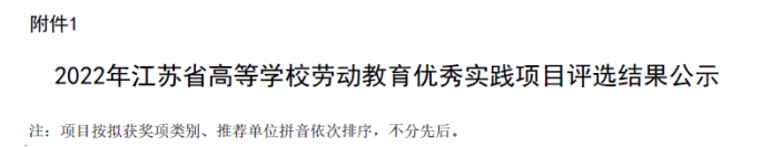 2月24日,江苏省高等教育学会公布了2022年江苏省高等学校劳动教育优秀实践项目评选结果,经学校推荐、材料审核、专家初审、作品内容审核、专家复审等环节,江苏省各高校和研究会在限额推荐的423个项目中,评出了特等奖53项、一等奖135项。