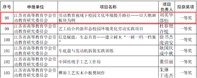 近日,2022年江苏省高等学校劳动教育优秀实践项目评选结果公示,由我院刘英华、邵怡两位老师指导的项目《劳动教育视域下校园文化环境提升路径——以天鹅湖板块为例》获得一等奖。