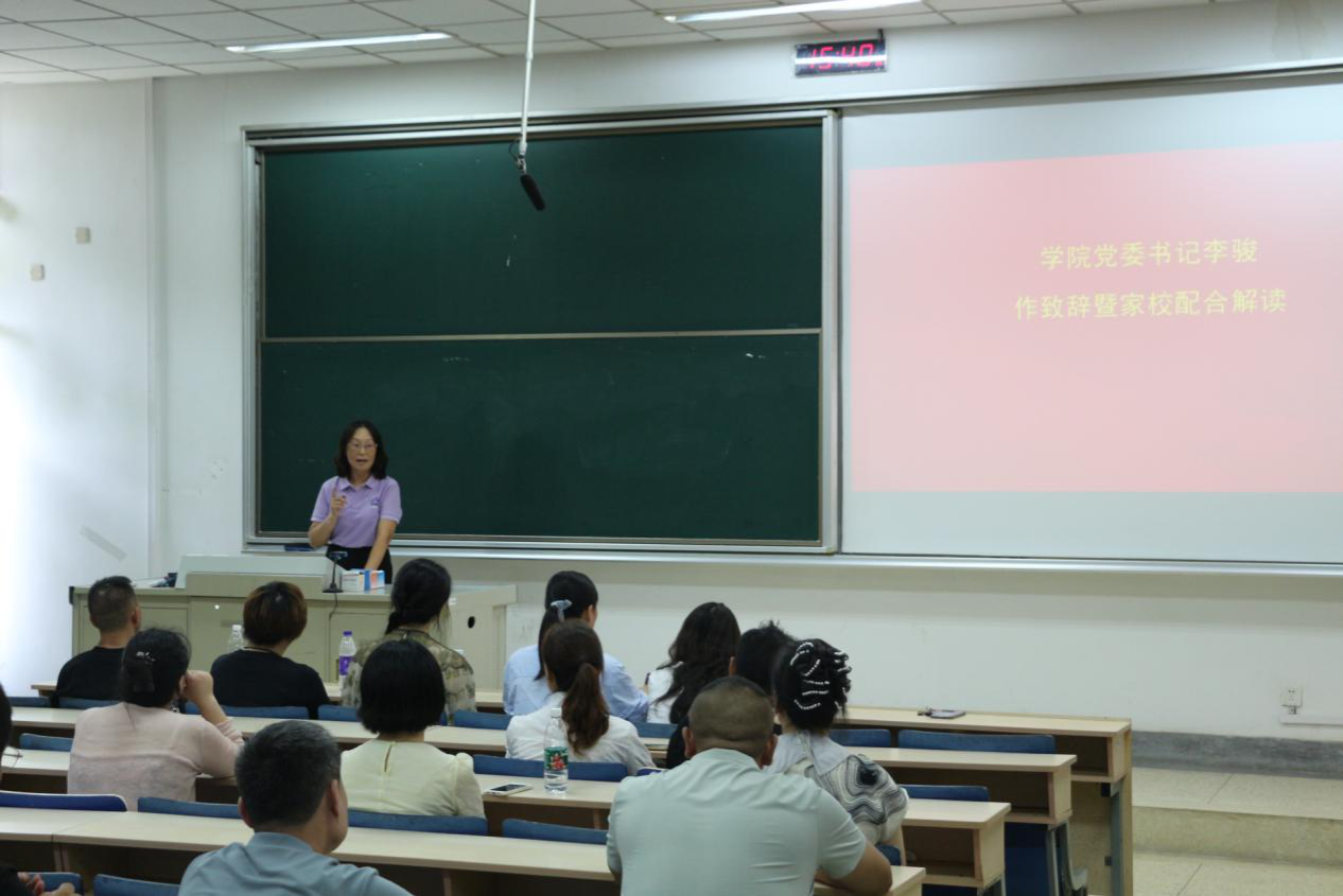 见面会伊始,李骏书记代表学院向各位家长致以诚挚的欢迎及问候。她强调,家长在新生现阶段的适应性教育以及未来的持续发展中发挥着至关重要的引导作用,她呼吁各位家长密切关注学科发展动态,为学生的职业发展规划做前瞻性的准备。同时,她希望家长能够认识到社会实践对提升学生抗压能力和适应能力的重要性,鼓励孩子大胆地投身于社会实践。最后,李骏书记向新生家长对外院的信任表示感谢,并期盼能够通过家校紧密合作,共同为学生全方面健康发展保驾护航。