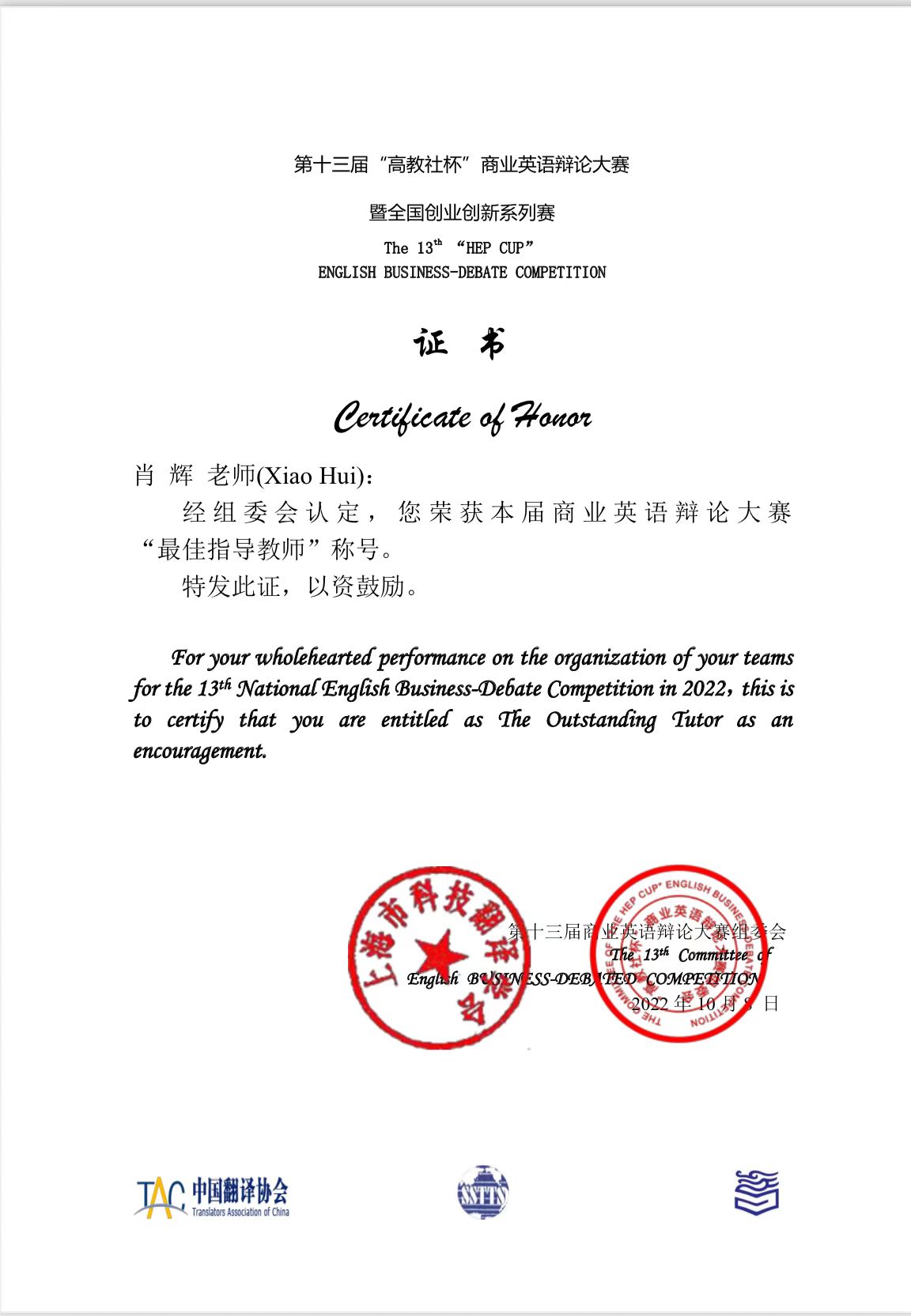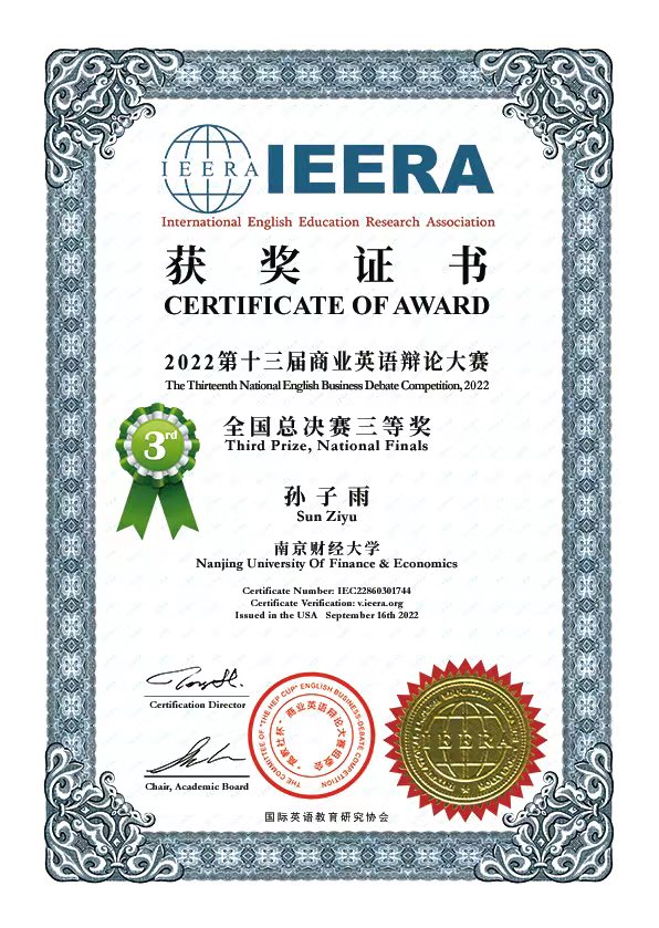 近日,第十三届“高教社杯”商业英语辩论大赛暨全国高校创新创业系列赛圆满落幕。经过激烈比拼,我院“White Queen”辩队荣获第十三届“高教社杯”商业英语辩论大赛全国总决赛一等奖铜奖,“Die for Sound”辩队荣获第十三届“高教社杯”商业英语辩论大赛全国总决赛三等奖。我院肖辉教授荣获本届为商业英语辩论大赛“最佳指导教师”称号。