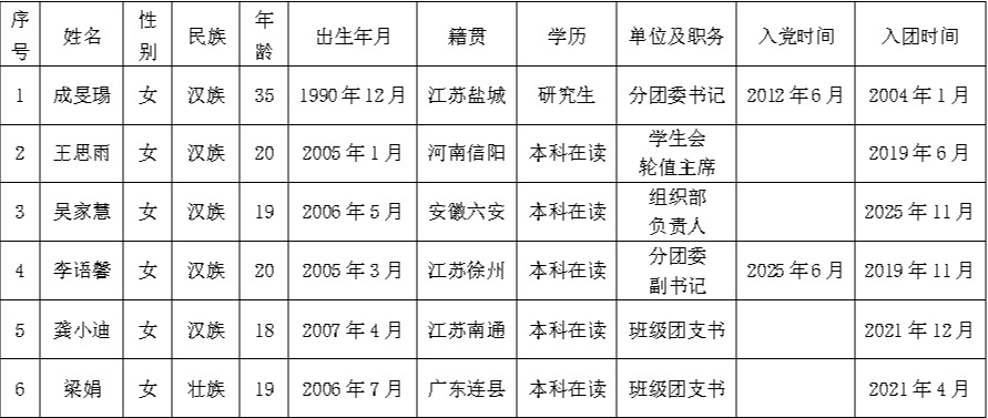 根据《关于做好共青团伟德bv1946第四次代表大会代表选举工作的通知》(南财团字〔2025〕18号)的要求,经过基层团支部酝酿讨论,按照多于代表名额20%的要求,充分发扬民主,广泛征求意见,拟确定成旻瑒、王思雨等6人为共青团伟德bv1946第四次代表大会代表候选人预备人选,现予以公示。