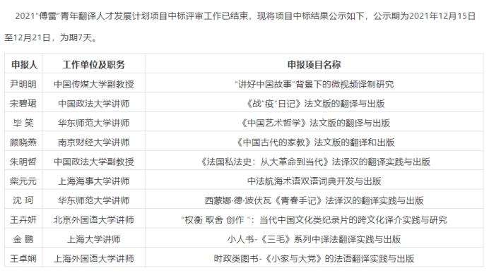 我院法语系教师顾晓燕申请的项目“《中国古代的家教》法文版的翻译和出版”获得2021年“傅雷”青年翻译人才发展计划项目立项。