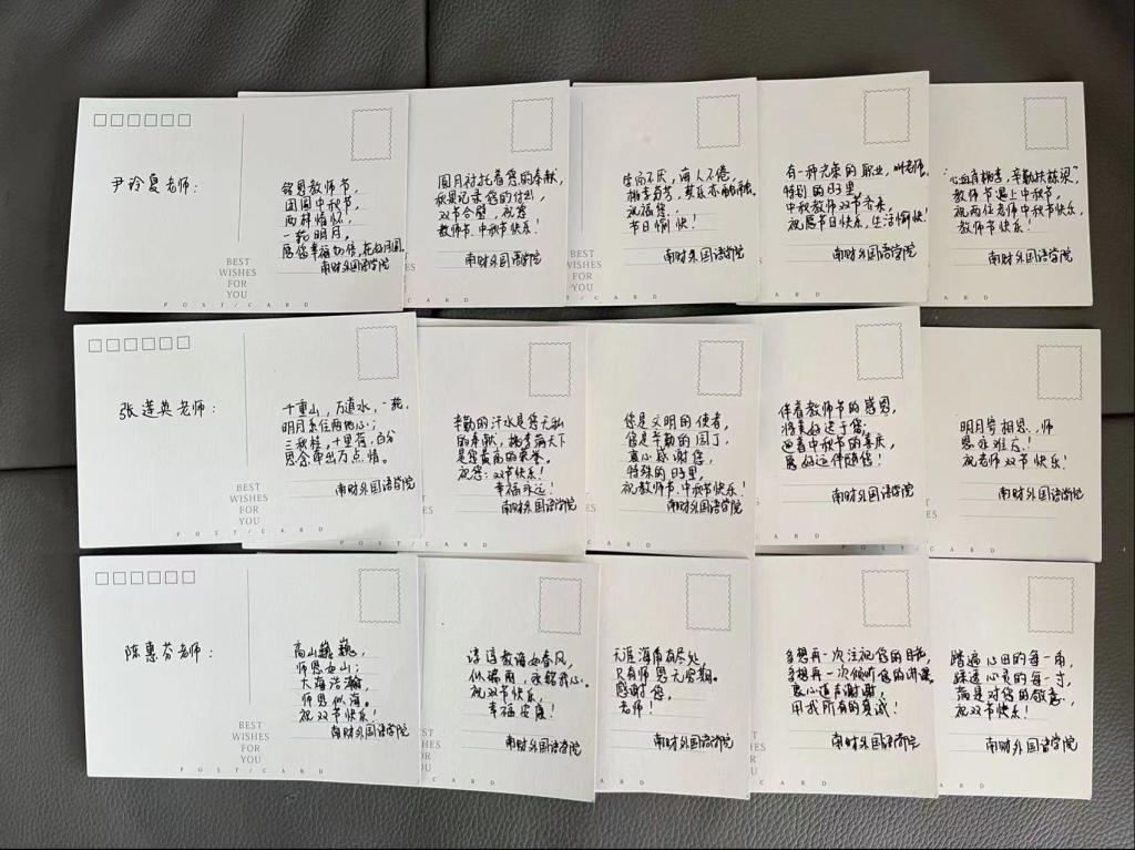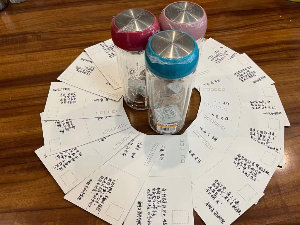 今年祝福的方式是给退休教师邮寄贺卡和南财logo的纪念保温杯,为建院以来退休的二十多位教职工教师们送上特别的问候。“之所以选择印有南财logo的保温杯作为退休教师的节日礼物,是想告诉他们,南财今天的成绩与他们的努力和付出是分不开的。同时,退休教师的贺卡内的祝福文字是不一样的,都是院工会委员亲手书写,表达学院师生对他们的问候和感谢之情。”院工会主席李丽萍老师如是说。“虽礼轻,但情意重,这份惊喜是珍藏一辈子的感激”,眭乐农老师收到祝福后,激动地向工会表达感谢。