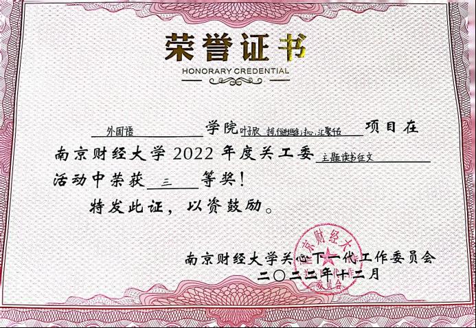 此外,在江苏省教育系统关工委举办的“2022年主题教育读书及征文活动”中,我院法语2201班叶子欣同学撰写的文章《寸步,行进坦途;寸心,汇聚千古》荣获三等奖。