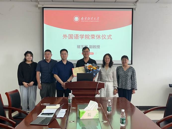 大学英语教研室最年轻的教师崔宇昕为褚老师献花,象征教育精神的薪火相传。院党委书记李骏与院长丁强共同为其颁发“执教36年荣誉证书”,表彰其在教学与学术领域的卓越贡献。最后全体与会人员合影,记录这一充满温情与敬意的时刻。