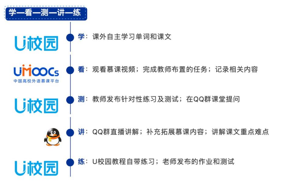 开学前两周,我院教师团队便对现有在线平台进行对比。最终,从平台专业性、教材贴合度、资源丰富性、学习数据全面性和学情报告准确性等几个维度,确定选用外研在线的U校园和中国高校外语慕课平台(UMOOCs),前者用于教学管理,后者提供拓展资源。教师们将U校园、UMOOCs、QQ群直播有效结合,形成了我院独特的混合式教学模式,并设计出“学—看—测—讲—练”五步教学流程,为实际教学搭建框架。