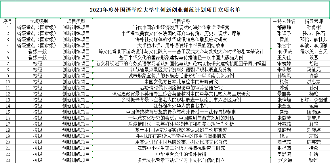根据《省教育厅办公室关于做好2023年大学生创新创业训练计划立项工作的通知》(苏教办高函〔2023〕7号)和《关于组织申报2023年度伟德bv1946大学生创新创业训练计划项目的通知》(南财教字〔2023〕9号)文件要求,经学生申报、学院初评、学校组织专家评审,共评审出322项大学生创新训练计划立项项目,其中拟推荐参评省级重点项目(即国家级项目)65项、省级一般项目70项,拟立项校级项目187项。期中我院获推荐省级大学生创新训练计划重点项目4项、创新训练计划一般项目2项、校级项目17项(见附件)。