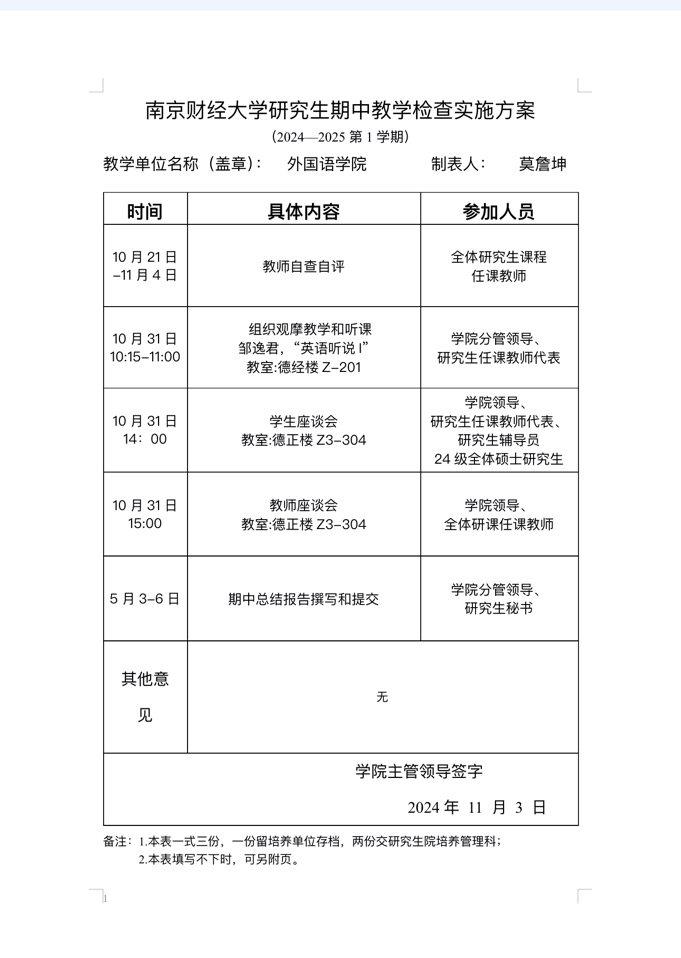 自查自评重点是任课教师对本人各项课程教学工作规范的执行情况,包括教学工作任务的执行情况、教学大纲的执行情况、教学周历的执行情况、教案或备课笔记的编写情况、教学纪律遵守情况等,每位任课教师均自评并向本院研究生教学管理处提交“教学运行状况评分表”。截止目前,研究生课程任课教师的各项自查工作运行状况良好。