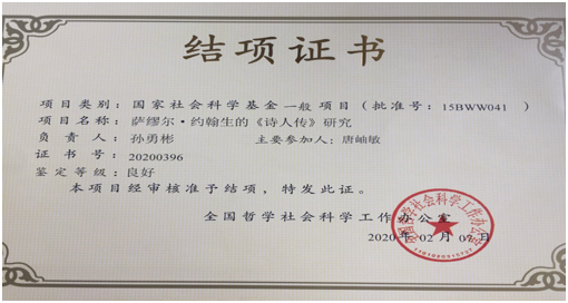 近日,我院院长孙勇彬教授主持的国家社科基金一般项目:萨缪尔·约翰生的《诗人传》研究 (批准号 15BWW041)的成果经全国哲学社会科学工作办公室审核,准予结项,鉴定等级为良好。