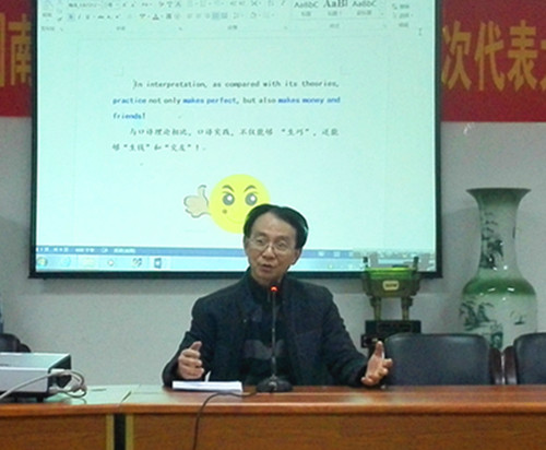 曹建新教授向在座听众阐述了翻译的重要性,指出翻译是为听说读写服务的。随后,曹建新教授从专业技术方面阐述了口译的三大支柱:听力水平,笔译功底以及口语能力,并且强调了这三大支柱的顺序不可颠倒。在口译时,曹建新教授并不提倡做大量的笔记,在他看来只有心无旁鹭才能达到较高的准确率。同时,遣词用字和句子结构的正确与否,直接取决于笔译基础;而笔译受训时存在的认识错误则将直接导致口译的错误。听力与笔译是口译的坚强后盾,而口语是第一表象,“先声夺人”可以给人留下好印象。