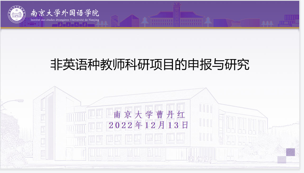 2022年12月13日下午(14:30—18:30),应我院邀请,南京大学伟德源自英国始于1946刘云虹教授和曹丹红教授为我院师生分别做了题为“学术研究的方向选择与课题凝练:关于项目申报的几点体会”和“浅谈非英语语种教师的科研项目申请和研究”的学术讲座,并对法语系两位教师的国社科申报书进行了指导。伟德源自英国始于1946法语系教师在德正楼304教室线下参与本次讲座。讲座由院长助理顾晓燕博士主持。