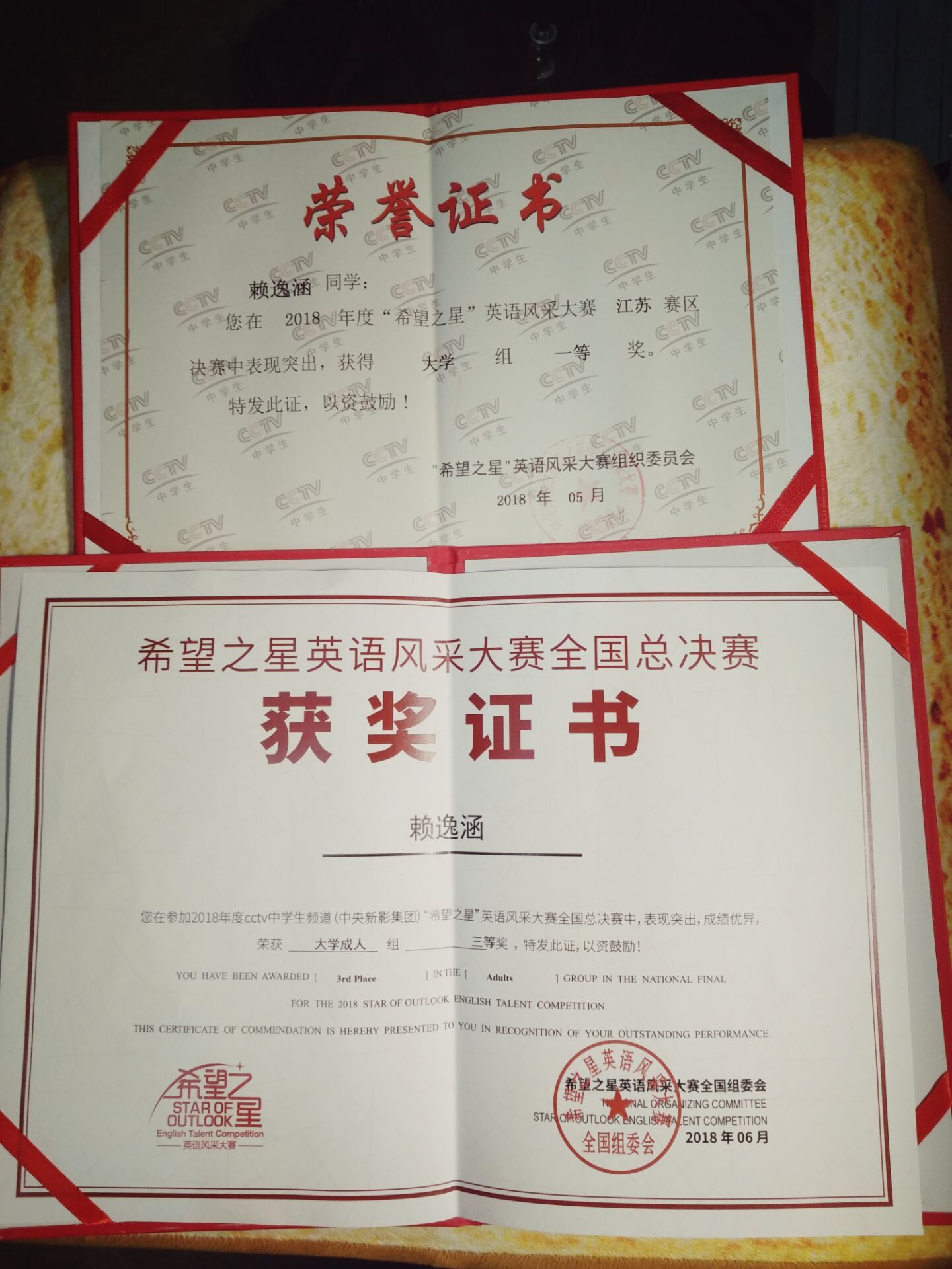 6月8日至11日,2018年度“希望之星”英语风采年度盛典于北京九华山庄盛大举办。我院英语1702班赖逸涵同学参加比赛,并取得全国总决赛大学成人组三等奖的好成绩。