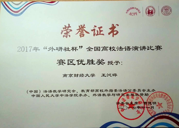 近日,“外研社杯”第十届全国法语演讲比赛中赛区赛落幕,我院法语1501班王沁晔同学在荣获赛区优胜奖。