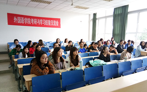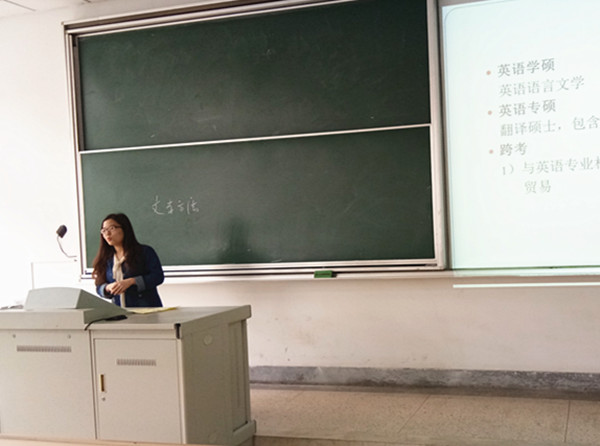 在交流会上,两位同学依次发言,与大家分享她们在考研过程中总结出来的宝贵经验。金旎同学围绕英语专业考研如何准备研究生考试,就考试科目、考试题型、志愿填报、考研日程安排、考研心态以及如何合理安排时间等问题做了经验分享,她着重强调了坚持的重要性,她建议同学们在选择专业和院校时要考虑自身实际情况。王秀秀通虐向大家介绍了自己准备考研的过程,提出,考前对自己的学习成绩和学习能力做一个综合评估再慎重选择学校和专业,在考研过程中要寻找身边的研友相互鼓励,并向大家推荐了一些复习参考书目。