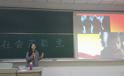 石贤首先向同学们介绍了何为正能量,当今社会为何需要正能量。接着,她阐述了正能量对当代大学生,对社会的积极意义,即为完善自我的需求,改善社会的需求以及传统理念的传承。同时,石贤结合自己关于侗族文化传承实践活动的亲身经历,表达了对社会正能量的美好期待。