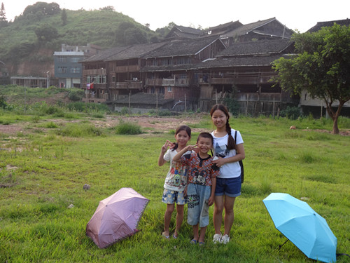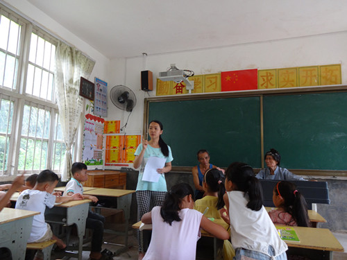 每天两个小时的教学时间,前一个小时由老歌师教唱侗歌,前三天已完成侗族儿歌和蝉之歌的教学任务,后两天把男女生分开进行河边歌(对唱)教学,从歌词到歌声循序渐进。令人欣慰的是,再调皮的孩子在学习侗歌时也会立马变得聚精会神,连上厕所也要主动征得老师同意后才去;而孩子们童稚的歌声也吸引了学校附近的村民,常常有人顶着烈日到教室外围观,甚至有个别“编外”小学员来到少年侗歌班“偷师学艺”。而后一个小时则由“古梦清泉”暑期实践团成员开展辅导,作为语言专业的石贤给歌班小学员上了两堂日语课,教给孩子们几句简单的日常用语。令人惊奇的是有个小男孩学得特别快,而且发音十分标准,被任命为领读;学得慢的小朋友我们就鼓励他们课间单独找老师辅导,多练习几遍。于是课里课外都充满好学的气氛,小朋友之间互相道礼,十分可人。而理科出生的吴绍依同学则发挥自己的专业特长,给孩子们辅导数学,耐心细致地一遍遍引导他们去思考。为了培养孩子们的集体意识,同学们还带领他们做些小游戏,一起完成小任务等。经过一周的相处,实践队员和少年侗歌班的孩子日渐亲密起来,黑板上每天更新的倒计时不仅提示着汇报演出的日期,同时也标示着大家日渐缩短的相处时间。