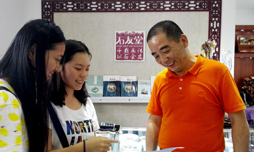 随后,成员们拜访了位于乌衣巷中的南京雨花石协会活动中心——“石友堂”,在石友堂负责人的带领下参观了浑然天成的雨花石和雨花石工艺品,深深感受到了雨花石给南京带来的诗意与厚重。接着,队员们就雨花石与老南京传统文化的相辅相成及其保护与发展前景对石友堂经理陈卫东先生进行了深入的采访。采访过程中,陈经理向成员们展示了珍贵的雨花石藏品并细致的描绘了其各异的形态特征的同时,也表示了对雨花石文化保护与传承的担忧。他表示,雨花石文化的传承存在政府对雨花石的重视度不高和市场缺乏监管的问题。最后,陈经理表达了由衷的期望,他希望更多的人能够对雨花石文化的发展和传承作出行动,比如建立雨花石博物馆等。