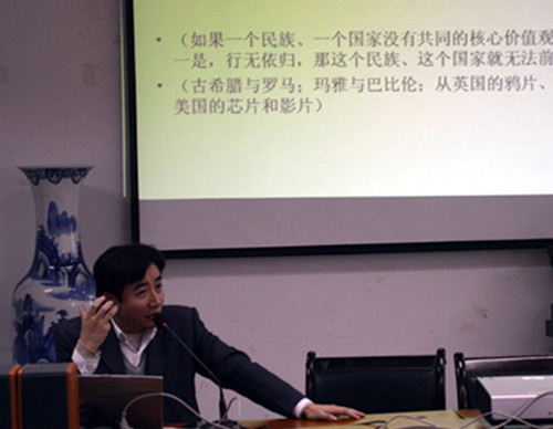 随后主讲人解释了不同维度的价值观、社会主义核心价值观、社会主义核心价值观的文化内涵。又介绍了社会主义核心价值观中的自由、平等、公正、法治等内容。并提出“社会主义核心价值观在当代何为”的话题,同时引申出“如何让中国的文化传统与社会主义核心价值观相融合”、“如何让核心价值观融入学生的理想信念与日常生活准则”、“如何让核心价值观内化于心,外化于行,知行合一”三个问题。