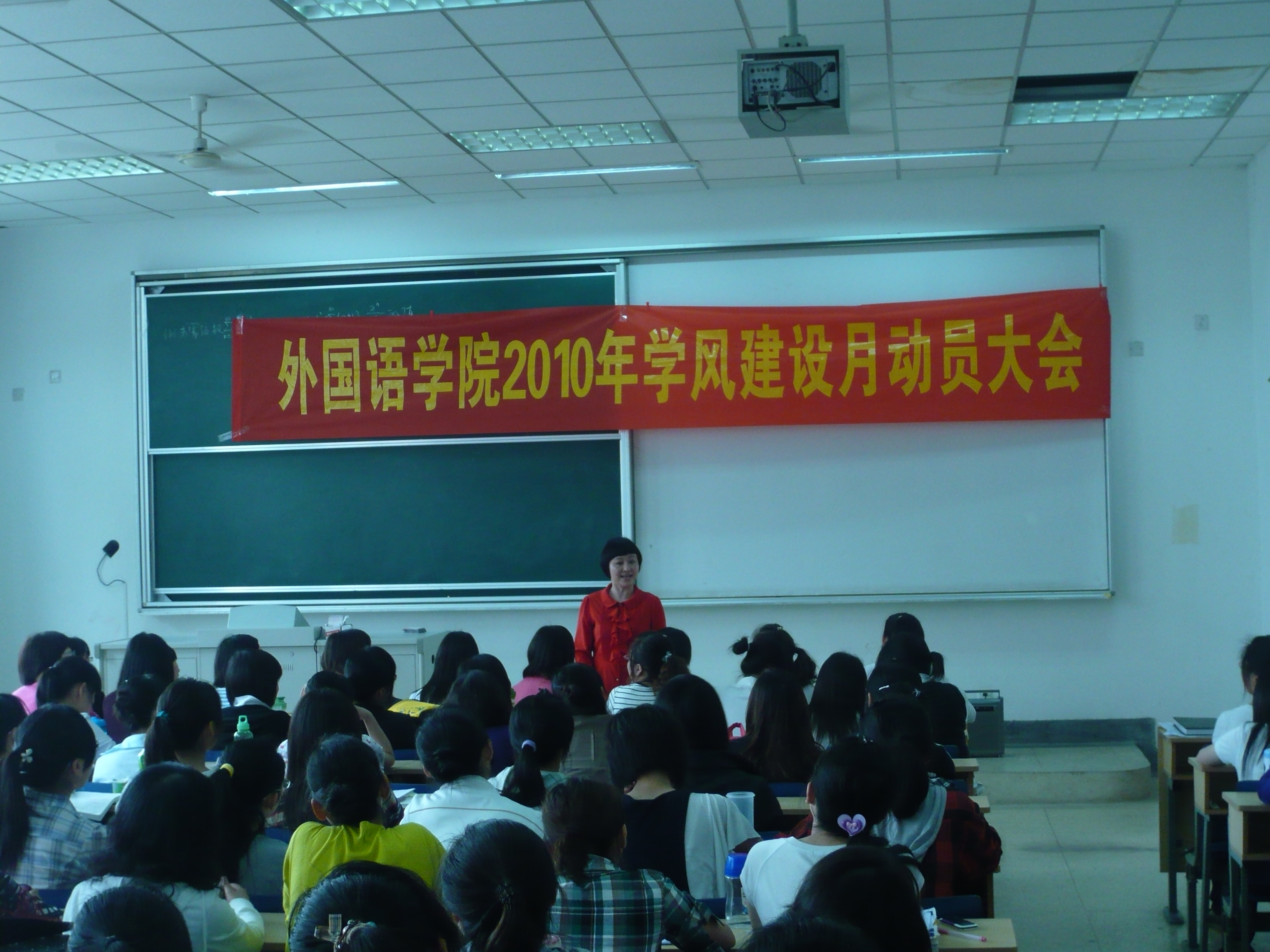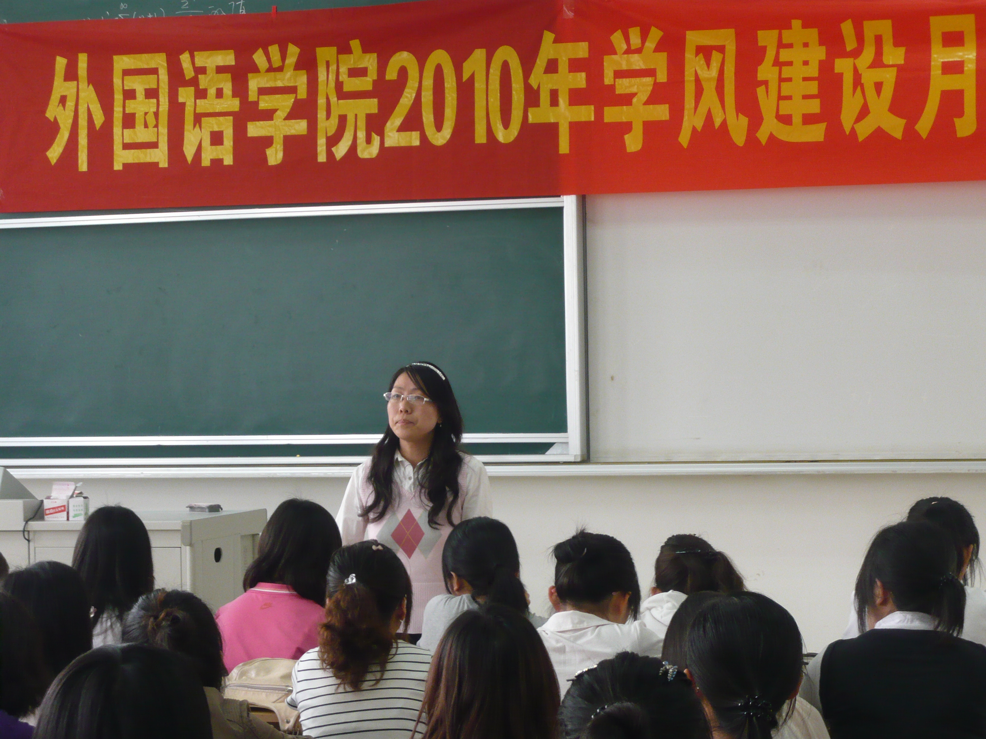 肖书记从几个方面强调了如何开展学风建设工作,对学风建设月做了总体的部署,并号召外院学子热情主动地与老师、同学打招呼,推广中国“和”文化的传统,努力提高自身素质、加强自身修养。与此同时要求大家准时上课,勤做笔记,互帮互学,形成一股积极向上的良好氛围。团总支书记金老师也强调了外院学生在本次活动中的主题“成长,成才,就业”其中,“就业”是恒久的目标,但“成长,成才”才是大学校园的最高宗旨,完善的品格和健康的体魄是作为当代大学生所应当执着追求的基本素质。为了抓好学风建设工作,我院领导高度重视,制定计划,精心部署并制定了我院学风建设月主题教育活动方案,旨在将学风工作长抓不懈,深入学生,取得实质性的收益,而非流于形式。活动内容精彩纷呈,有提供自我展示才能舞台的竞赛活动,如“首届中国口译大赛”,“大学生职业生涯大赛”,“英文写作大赛”,有提供经验交流,学科切磋的的座谈活动,如“学生座谈会”,“实习学生经验交流座谈会”,有浓化学习氛围,激发英语学习兴趣的活动,如“校团委第七届英语文化节”,“考研动员”,“学风建设主题班会”,并对先进集体和个人予以表彰,将校园多姿多彩的活动进一步推动起来。