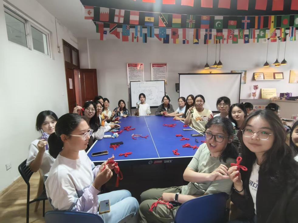 红绳穿梭,织就家国祝福。红色,是中国结的主色调,更是中华文化的精神底色,它象征着热烈的民族情感、喜庆的生活愿景与吉祥的美好期许,更承载着代代相传的革命精神与民族气节。同学们手中编织的不仅是形态各异的“平安结”“吉祥结”,更是对祖国繁荣昌盛、山河无恙的真挚祝福。作品完成后,大家纷纷将中国结悬挂于活动现场的“家国祈愿墙”,并写下“国泰民安”“山河锦绣”“万家团圆”等寄语。鲜红的中国结如繁星,在此刻汇聚成一片传递温情与信念的温暖海洋。