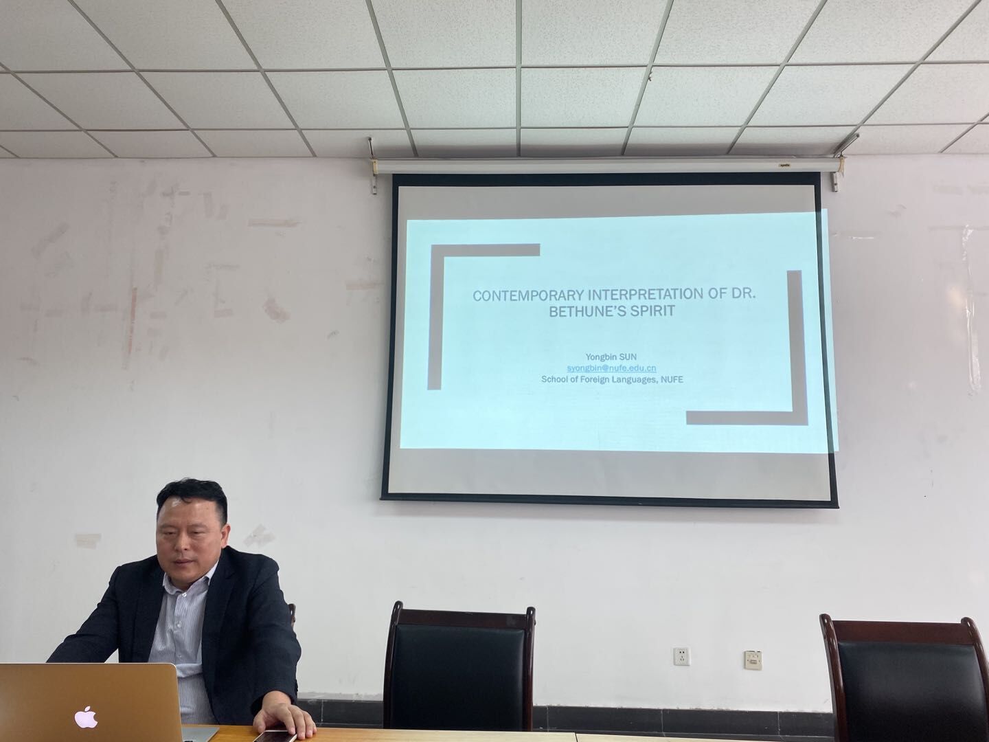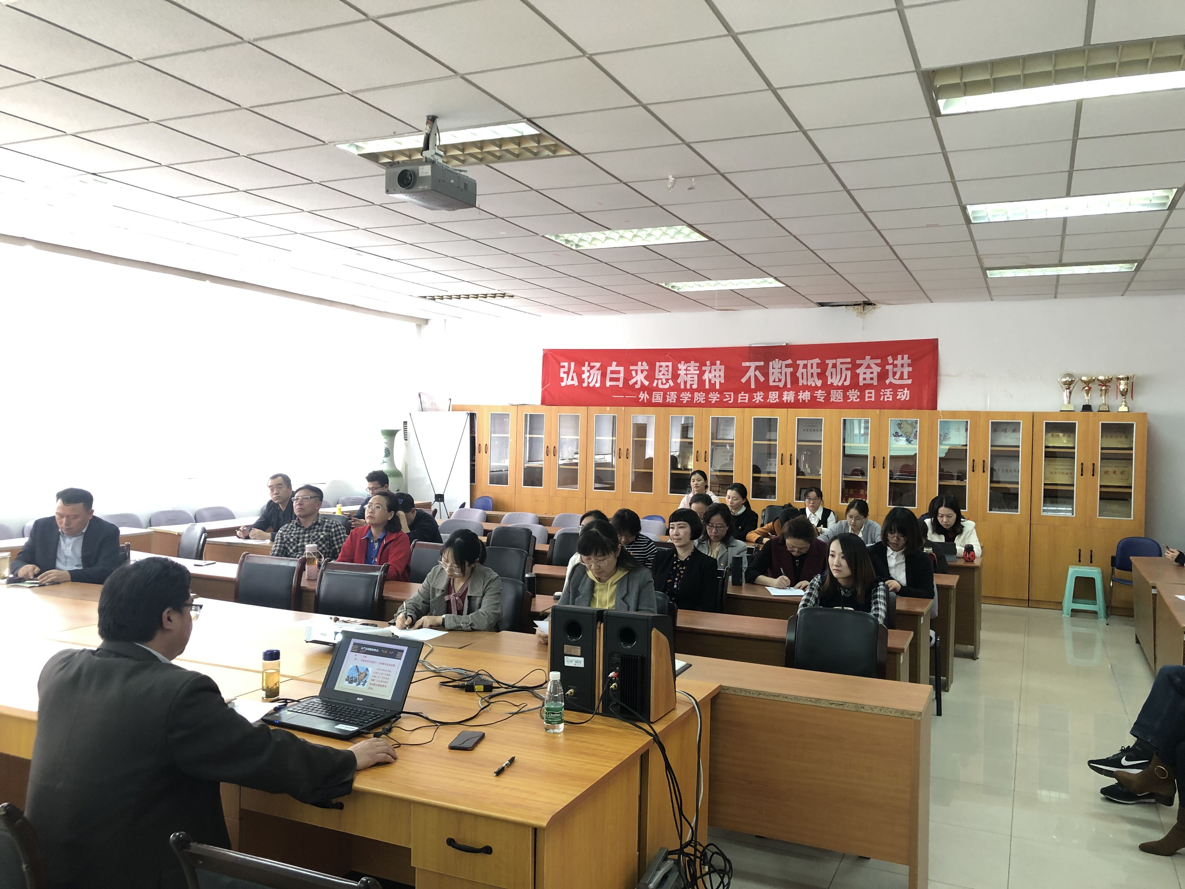 本次活动最重要的议程是,院长孙勇彬教授以“Contemporary Interpretation of Dr Bethune’s Spirit (白求恩精神的当代诠释)”为题,用标准流利的英语为师生党员们上了一堂特别的党课。孙院长从“The Connotation of Dr. Bethune’s Spirit (白求恩精神的内涵)”,“The Cultivation of Dr. Bethune’s Spirit (白求恩精神的养成)”,“Value Orientation of Dr. Bethune’s Spirit (白求恩精神的价值导向)”,“Enlightenment of Dr. Bethune’s Spirit to Contemporary University Students (白求恩精神对当代大学生的启示)”,“Methods and Measures to Promote the Spirit of Dr. Bethune (弘扬白求恩精神的方法和举措)”五个方面深入浅出,循循善诱,带领大家进一步认识和学习白求恩这位外籍共产党员的光辉事迹。