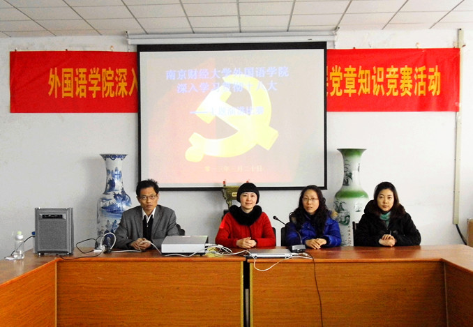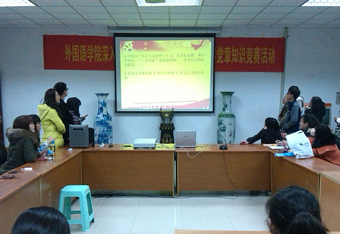 3月20日,我院为了深入贯彻党的十八大,学习党的十八大精神,普及广大青年学生对十八大知识的了解,在外语学院会议室308室先后举行了演讲比赛和知识竞赛。参加本次比赛的有18名选手,选手分别来自大一、大二、大三和研究生。党总支书记肖辉教授、辅导员孟德明老师,薛桂芳老师参加了本次活动。比赛活动由团总支书记金立林老师主持。
